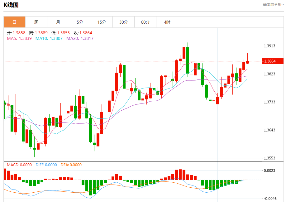 技术点评:RSI技术指标大于中性区域50。 MACD技术指标处在其信号线之上看多。 配置为正。 此外,价位高于其20天及50天移动平均线 ( 分别位于1.3854 和1.3852 )。