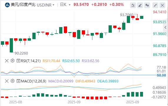 自周三以来,印度卢比兑美元汇率一直在89.10左右的历史高点附近横盘整理。美元/印度卢比货币对的绝对走强也受到乐观的美元推动,美元在周四美国关键数据发布后进一步扩大了上涨空间。