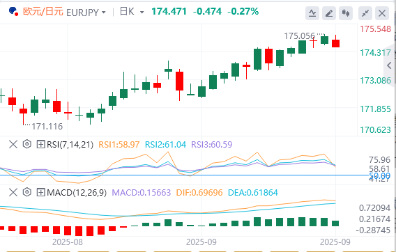 下行方面,欧元/日元的初步支撑位位于174.05,即9月23日的低点。任何低于该水平的后续抛售都可能导致跌至173.48,即9月19日的低点。另一个值得关注的下行过滤器是布林带下限172.00。