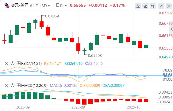 周五,澳元/美元汇率交投于0.6570附近。每日时间框架的技术分析表明,该货币对正在反弹至上升通道,表明看涨偏见复苏。然而,14天相对强弱指数(RSI)仍低于50水平,表明看跌倾向正在发挥作用。