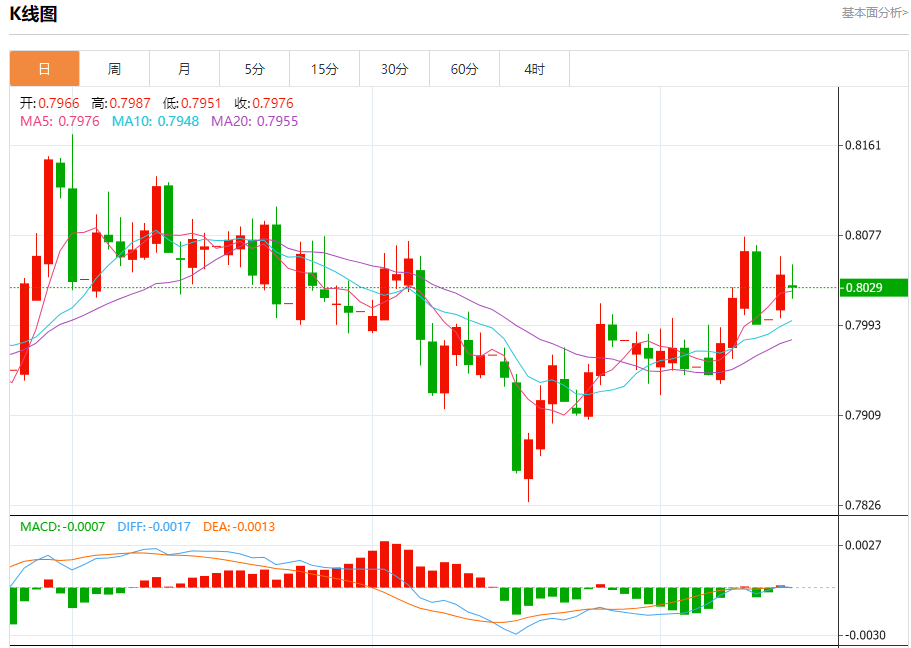 今日周二,澳元兑美元报0.6454,跌幅0.92%;美元兑加元报1.4051,涨幅0.10%;美元兑瑞郎报0.8030,跌幅0.16%。
