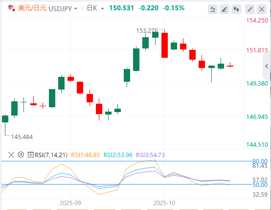 美元/日元周一坚挺,徘徊在150.60附近,原因是美联储停电期和政府关门导致美国数据缺乏,存在风险偏好环境。美国总统唐纳德·特朗普缺乏触动市场的评论,可能会使该货币对保持在熟悉的水平。