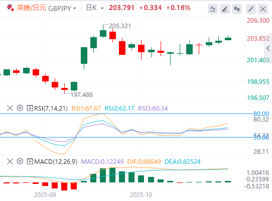 英镑/日元在测试199.80-201.15区间的突破区域后,将其复苏走势延续至204.00附近。20日指数移动平均线(EMA)在201.50附近起到支撑作用,目前交投于202.30附近。