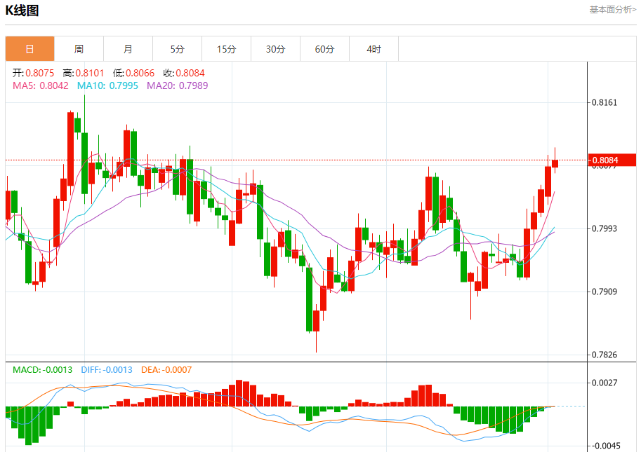 今日周二,澳元兑美元报0.6494,跌幅0.66%;美元兑加元报1.4083,涨幅0.19%;美元兑瑞郎报0.8086,涨幅0.19%。