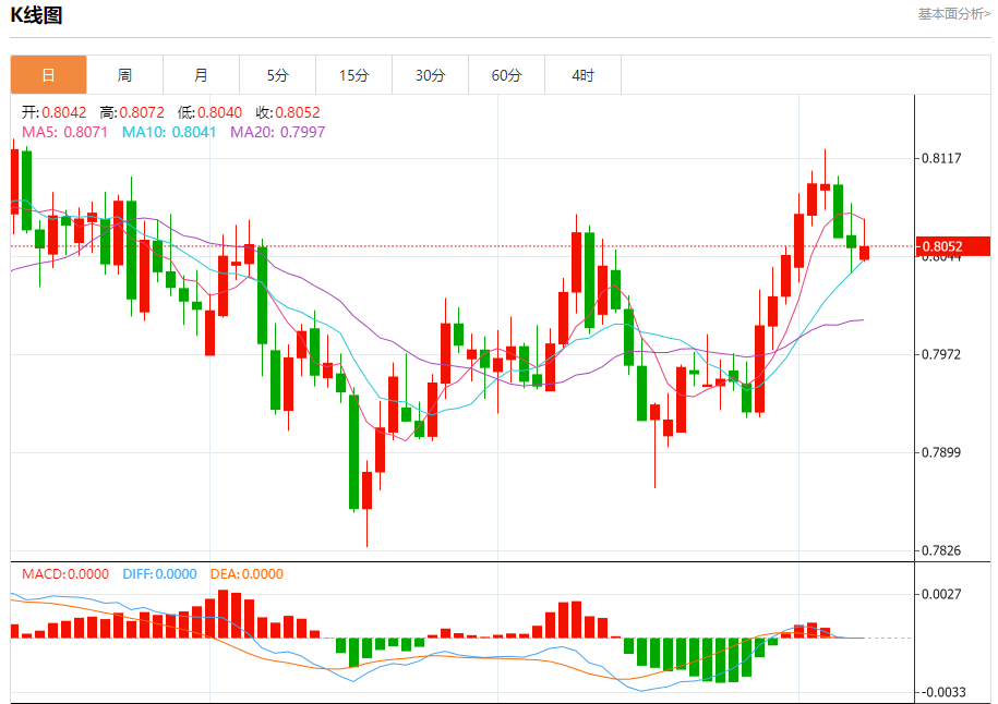 今日周一,澳元兑美元报0.6535,涨幅0.62%;美元兑加元报1.4014,跌幅0.23%;美元兑瑞郎报0.8054,涨幅0.01%。