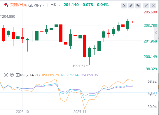 周一,英镑/日元上涨至五周高点204.53,上涨0.33%,因中日紧张局势加剧而日元走弱。
