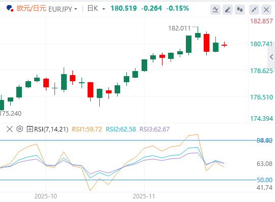 11月25日,欧元/日元在上一交易日上涨超过0.25%后,周二欧洲早盘交易约180.50。货币交叉在上升通道形态内向上移动,暗示持续多头偏向。