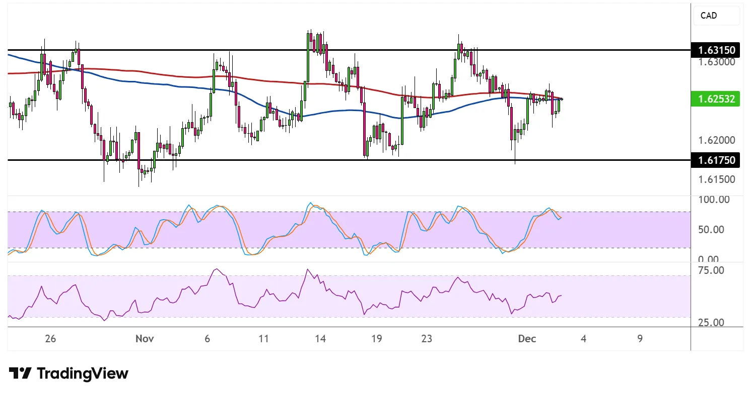 过去几周,欧元/加元一直在一个明确的区间内交易,在1.6175支撑和1.6315阻力之间波动。该货币对目前位于1.6253附近,徘徊在该盘整区的上界附近。