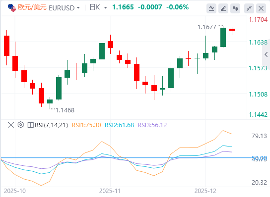 20周期简单移动平均线(SMA)上升至1.1631,位于50、100和200周期SMA(分别为1.1594、1.1586和1.1584)之上。短期和中期均线小幅上升,而200周期均线保持大致平坦,价格在所有均线之上。相对强弱指数(RSI)为62,保持坚挺且未出现超买情况,支持看涨偏向。