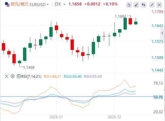 20期简单移动平均线(SMA)高于50、100和200期SMA,所有斜率均指向上方,价格保持在其上方。 20 SMA在1.1646提供了附近的动态支撑。 相对强弱指数(14)为59,保持中性至看涨的态势。