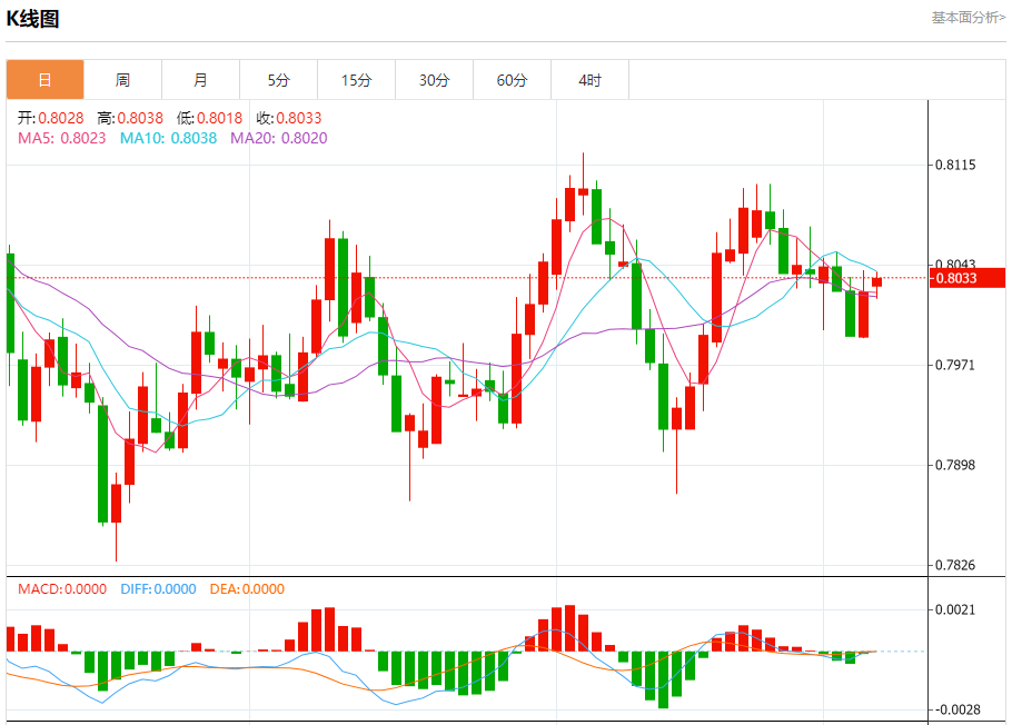 技术点评:RSI技术指标大于中性区域50。 MACD技术指标处在其信号线之上看多。 配置为正。 此外,价位高于其20天及50天移动平均线 ( 分别位于0.8012 和0.8006 )。