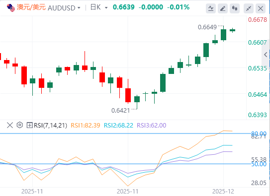 在下行方面,12月4日的低点0.6598将为买家提供一定的心理支撑和买入理由。然而,如果市场情绪持续低迷,汇率持续下跌,那么下一个支撑位将出现在12月1日的低点0.6532。若跌破这一位置,汇率可能会进一步回落至100日均线所对应的0.6520水平。这一系列支撑位的失守与否,将决定澳元兑美元汇率在短期内的下行空间和趋势走向。