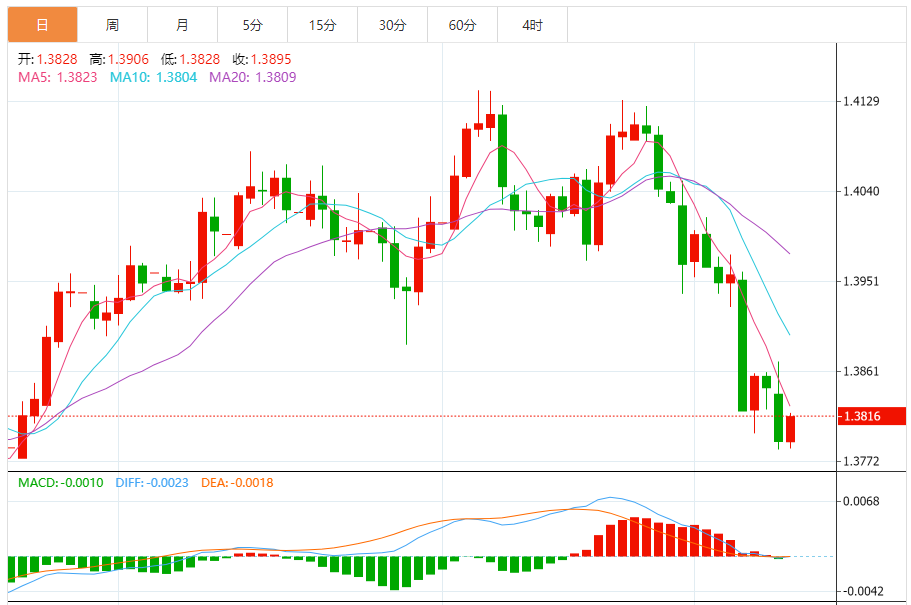 周四,美元/加元徘徊于1.3819下方,现交投于1.3817附近,涨幅0.18%。