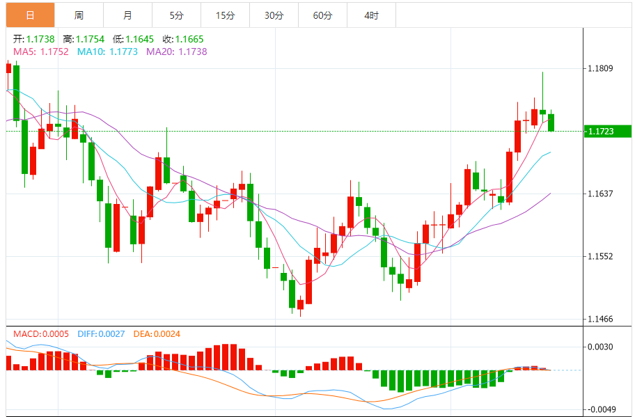 周三,欧元/美元徘徊于1.1724下方,现交投于1.1723附近,跌幅0.20%。