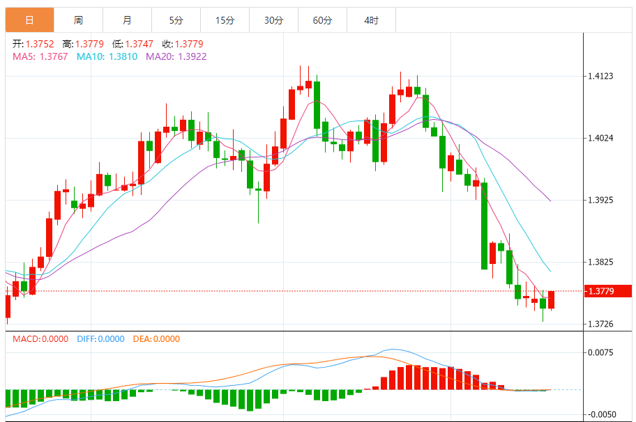 周三,美元/加元徘徊于1.3781下方,现交投于1.3779附近,涨幅0.20%。