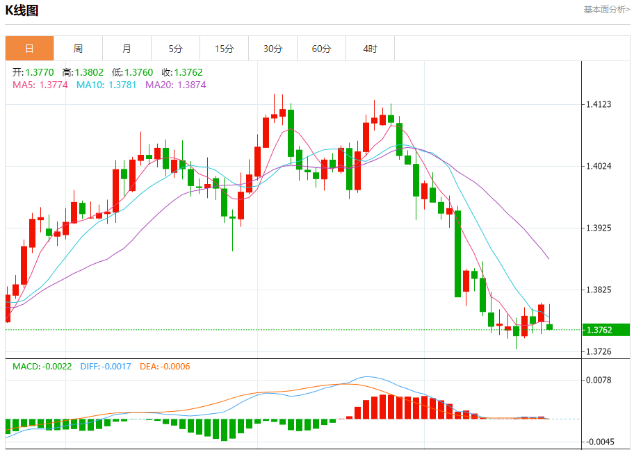技术点评:RSI技术指标大于中性区域50。 MACD技术指标处在其信号线之上看多。 配置为正。 此外,价位高于其20天及50天移动平均线 ( 分别位于1.3784 和1.3784 )。