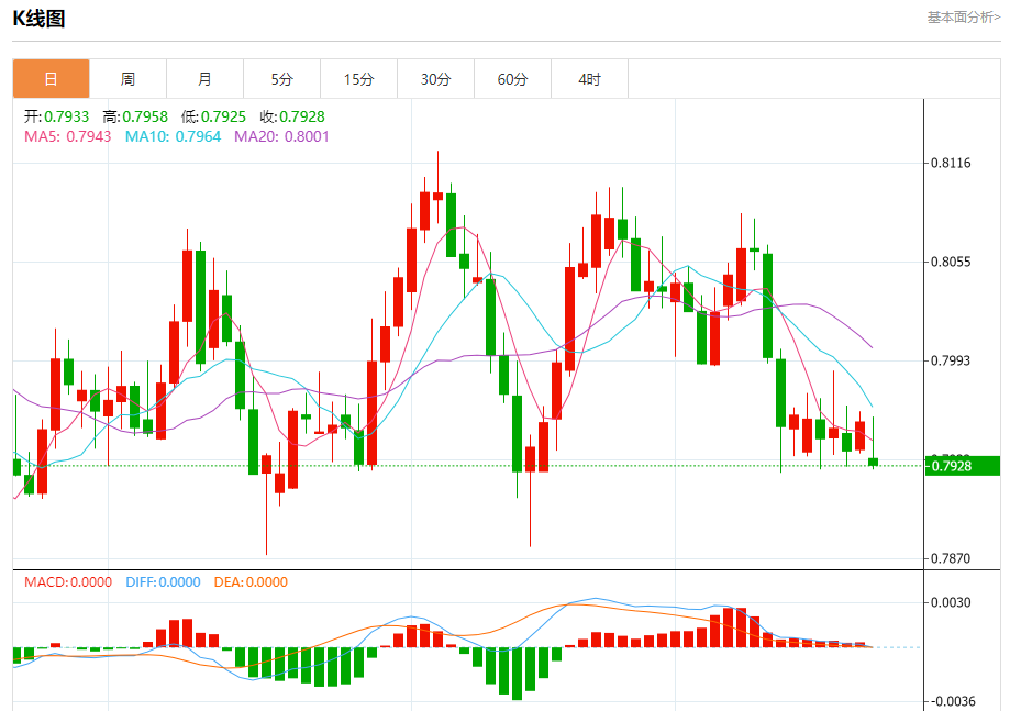 技术点评:RSI技术指标大于中性区域50。 MACD技术指标处在其信号线之下看空。 RSI突破50应该会触发进一步的损失。 此外,价位高于其20天及50天移动平均线 ( 分别位于0.7953 和0.7950 )。
