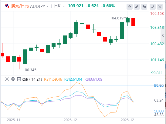 日线图中,澳元/日元报109.92。价格仍远高于上升的100日均线99.64,进一步强化了整体上涨趋势。平均指数已连续数周持续攀升,保持了多头偏向。RSI位于63.03,守在中性50上方,动能已从早些时候的超买读数中冷却,但仍具支撑性。价格位于布林中段103.09之上,且在104.74上段收缩,显示波动性降低。若突破上轨,决定性收盘可能为105.00心理关口铺平道路。