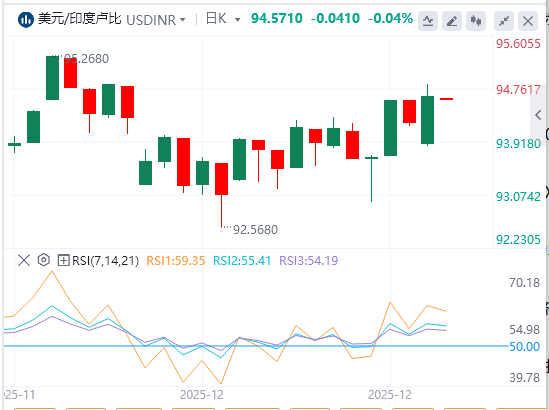 日线图中,美元/印度卢比报90.2950。20日指数移动平均线(EMA)上升至90.1809,保持短期偏向正值,价格保持在上方。