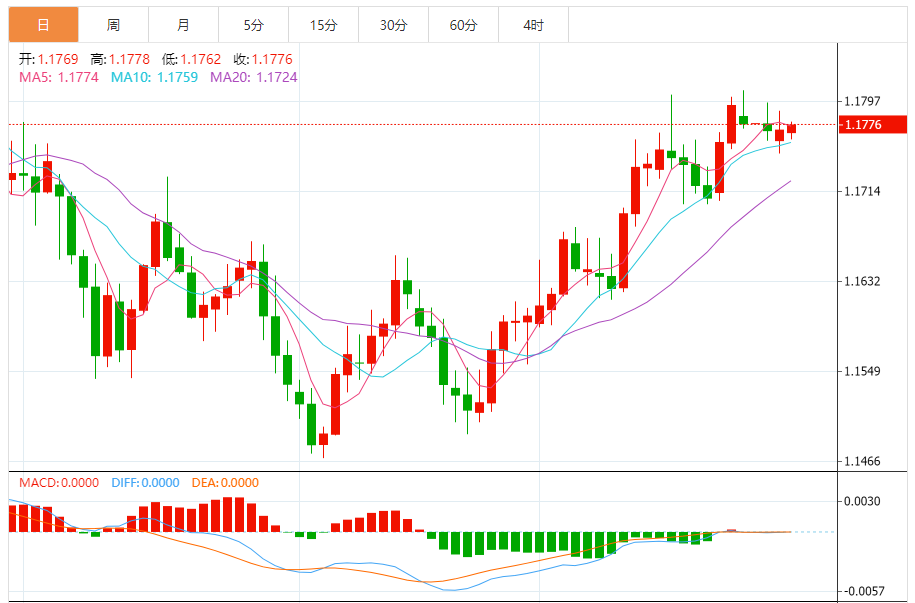 周二,欧元/美元徘徊于1.1777下方,现交投于1.1776附近,涨幅0.04%。