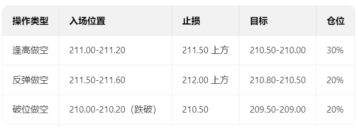 小时级别:支撑位210.50(日内低点)、210.00(整数关口);阻力位211.00-211.20(日内高点区域)、211.50(强压力位)。