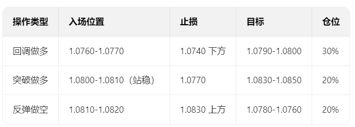 小时级别:支撑位1.0752(日内低点)、1.0750(整数关口);阻力位1.0795-1.0800(日内高点区域)、1.0810(强压力位)。