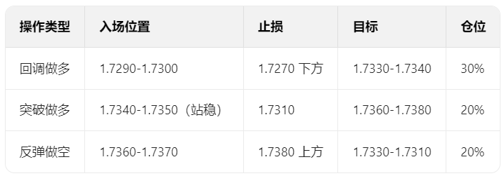 小时级别:支撑位1.7290(日内低点)、1.7280(强支撑);阻力位1.7340-1.7350(日内高点区域)、1.7360(强压力位)。