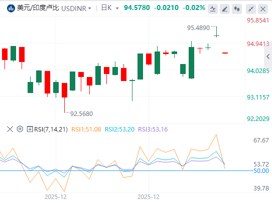 日线图中,美元兑印度卢比报90.4470。20日指数移动平均线(EMA)上行至90.2130,保持适度的多头偏向。价格保持在指标上方,表明需求下跌依然存在。