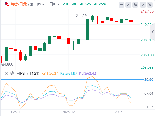 趋势线支撑目前位于210.50区域,但若跌破210.05(12月24日低点),则需确认211.50区域的三顶并暗示趋势转变信号。下一个下行目标为11月9日和10月高点208.90,以及12月19日低点208.00附近。