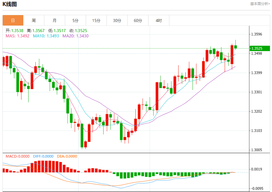 技术点评:RSI技术指标大于70。在这种情况下,说明有很强的上升趋势,或者意味着处在超买的状态下,可能会有向下的调整。我们将观察RSI技术指标是否出现背离现象。 MACD技术指标处在其信号线之上看多。 配置为正。 此外,价位高于其20天及50天移动平均线 ( 分别位于1.3491 和1.3460 )。