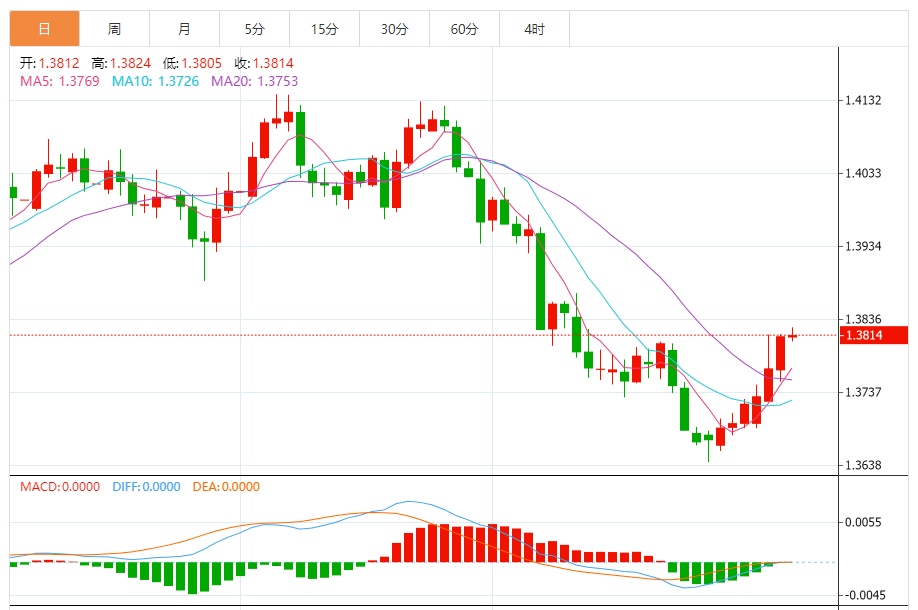 周三,美元/加元徘徊于1.3816下方,现交投于1.3814附近,涨幅0.01%。