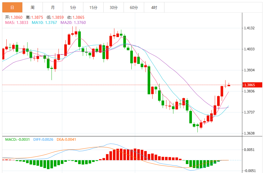 周五,美元/加元徘徊于1.3867下方,现交投于1.3865附近,涨幅0.03%。