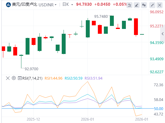 美元/印度卢比上涨至接近90.70。50日指数移动平均线(EMA)正在上升,并持续支撑这一上涨。价格走势保持在这一动态指标之上,抑制了回调。