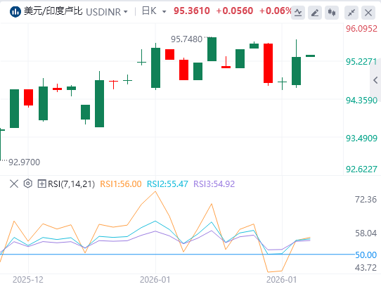 日线图中,美元/印度卢比报91.2570。20指数移动平均线(EMA)上行,位于价格90.4727下方,支撑着上涨趋势。