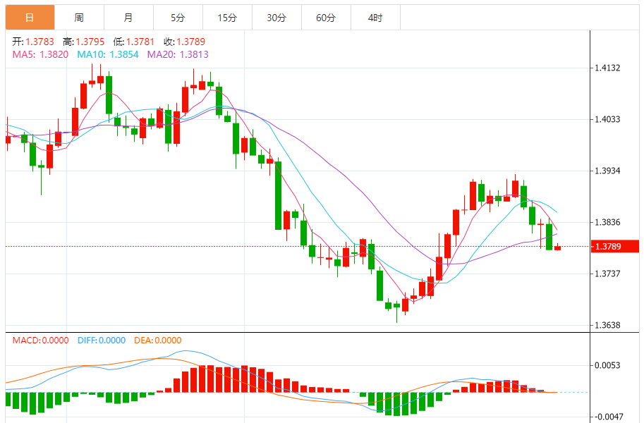 周四,美元/加元徘徊于1.3792下方,现交投于1.3789附近,涨幅0.04%。