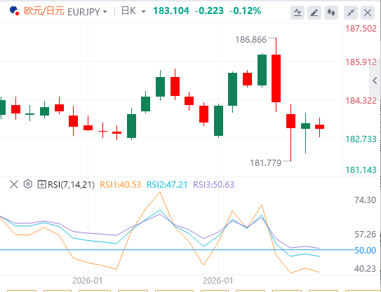 只要欧元/日元交易在100日均线以上,回调将保持修正性。若明显跌破该平均水平,中期情况将更加复杂。价格锚定在布林中线下方且靠近下游区间,阻力最小的路径偏向下行。RSI从近期读数回落,确认了动能正在放缓。