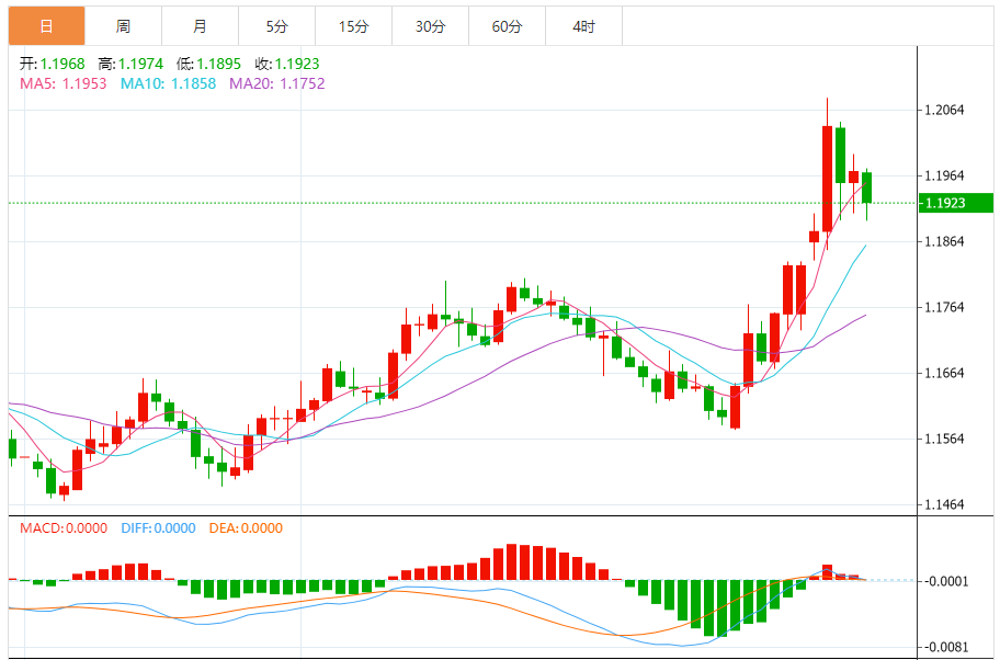 周五,欧元/美元徘徊于1.1924下方,现交投于1.1923附近,跌幅0.39%。