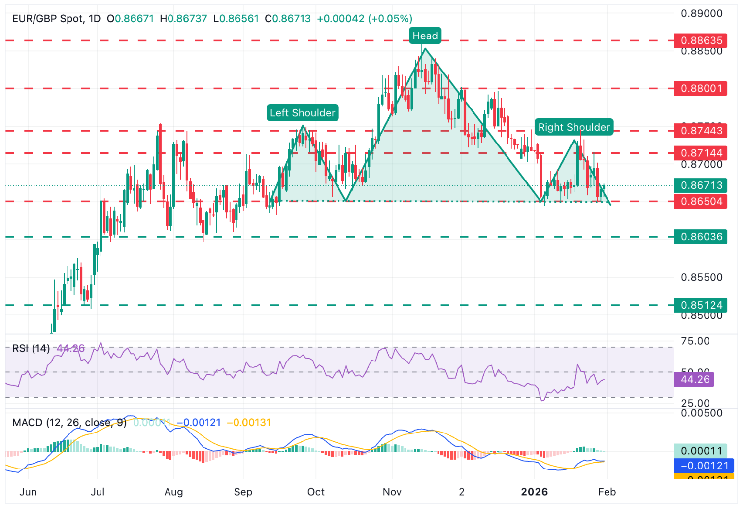 技术分析:欧元/英镑位于看跌头肩形态的颈线