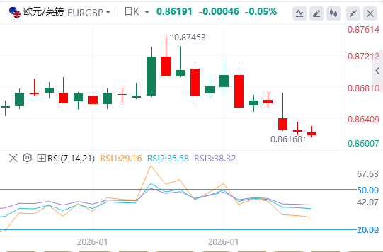 欧元/英镑在跌破大型头肩度形态颈线后,报价为0.8627,约在日线图中可见。这是一个看跌信号,可能确认2025年大部分时间内的上升趋势结束。