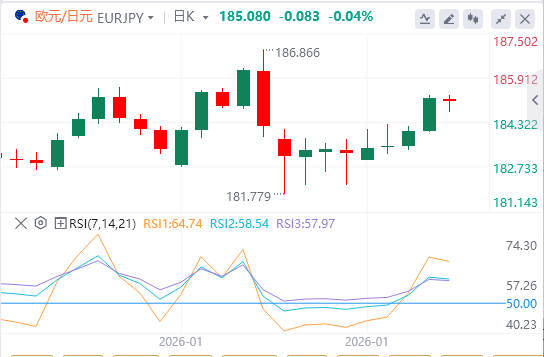 日线图中,欧元/日元保持100日均线上方,保持中期上涨趋势,并在现货下方留下缓冲。价格徘徊在布林带上方附近,显示随着布林带边缘扩张,持续的多头压力存在。RSI在57.50仍处于正区间,证实了这一偏向。近期支撑位于20日中段184.25,上轨186.00封顶即时顶部。