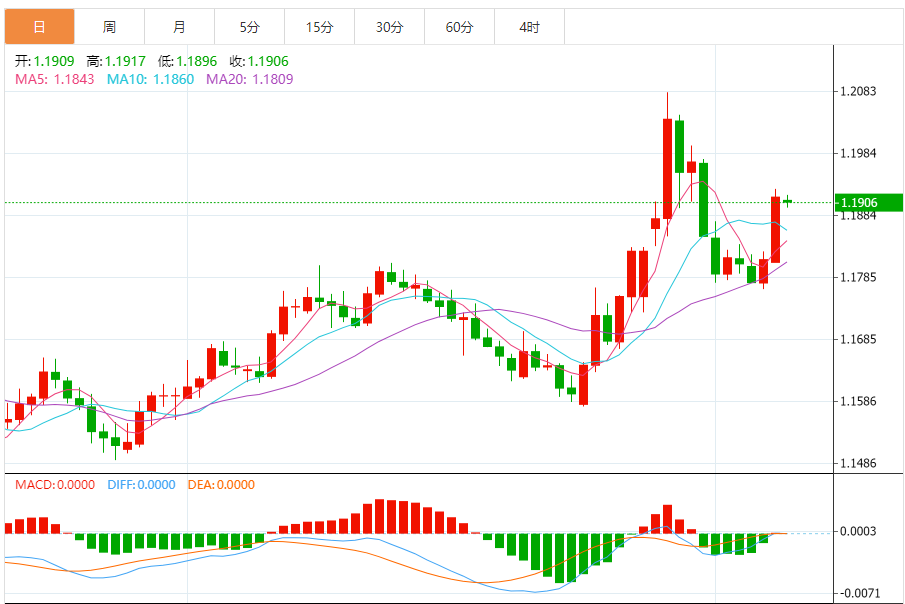 周二,欧元/美元徘徊于1.1907下方,现交投于1.1906附近,跌幅0.07%。