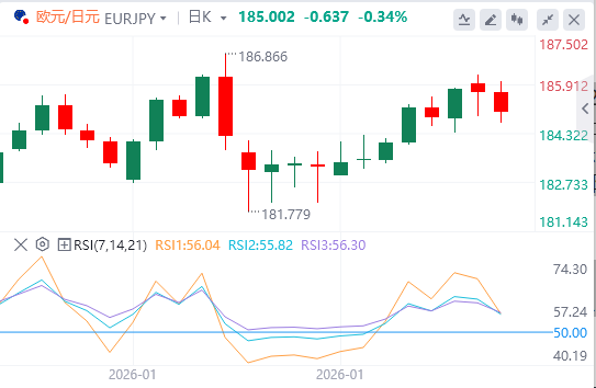 日线图中,欧元/日元稳稳守在100日均线180.62上方,保持了坚定的多头倾向,平均线持续上行。价格位于布林包络上半部,区间显示轻微收缩,显示波动性降低。RSI位于54(中性)显示动能稳定。若收盘持续收于186.28上方,可能延续涨幅;若跌破184.37附近中线,则暴露182.46附近下行支撑。