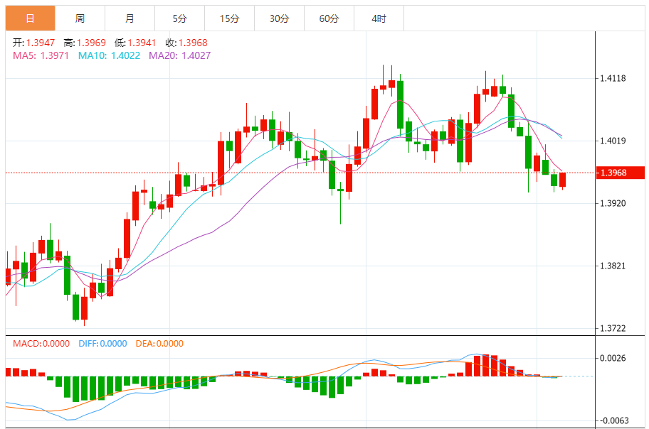今日周四,澳元兑美元报0.6607,涨幅0.08%;美元兑加元报1.3976,涨幅0.18%;美元兑瑞郎报0.8006,涨幅0.16%。 澳元兑美元汇率分析 技术点评:RI技术指标运行趋势复杂,倾向于上涨。 阻力位:0.66600.66450.6630 支撑位:0.65850.65700.6555 美元兑加元汇率分析 技术点评:只