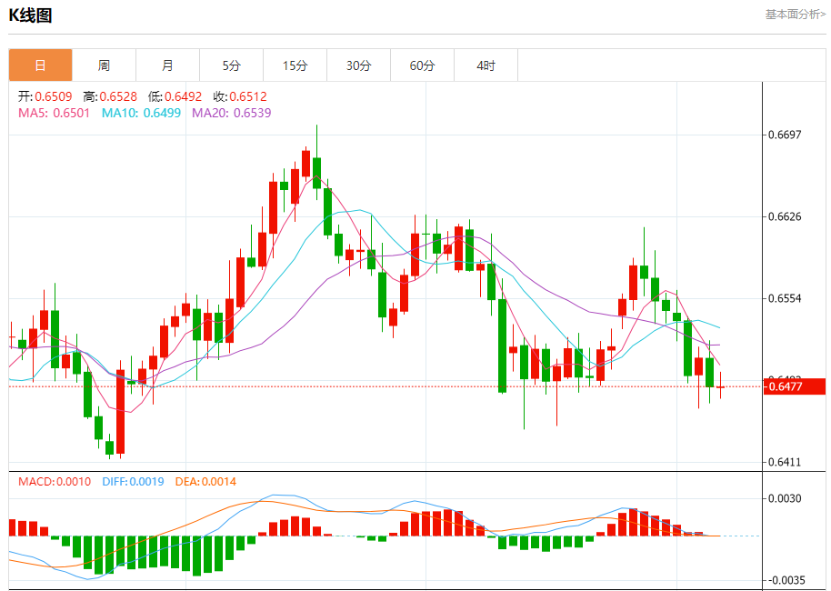 今日周五,澳元兑美元报0.6479,涨幅0.01%;美元兑加元报1.4115,跌幅0.02%;美元兑瑞郎报0.8059,跌幅0.02%。 澳元兑美元汇率分析 技术点评:只要依旧存在0.6500阻力位,很可能下跌至0.6460。 阻力位:0.65350.65200.6500 支撑位:0.64600.64400.6420 美元兑加元汇率分析 技