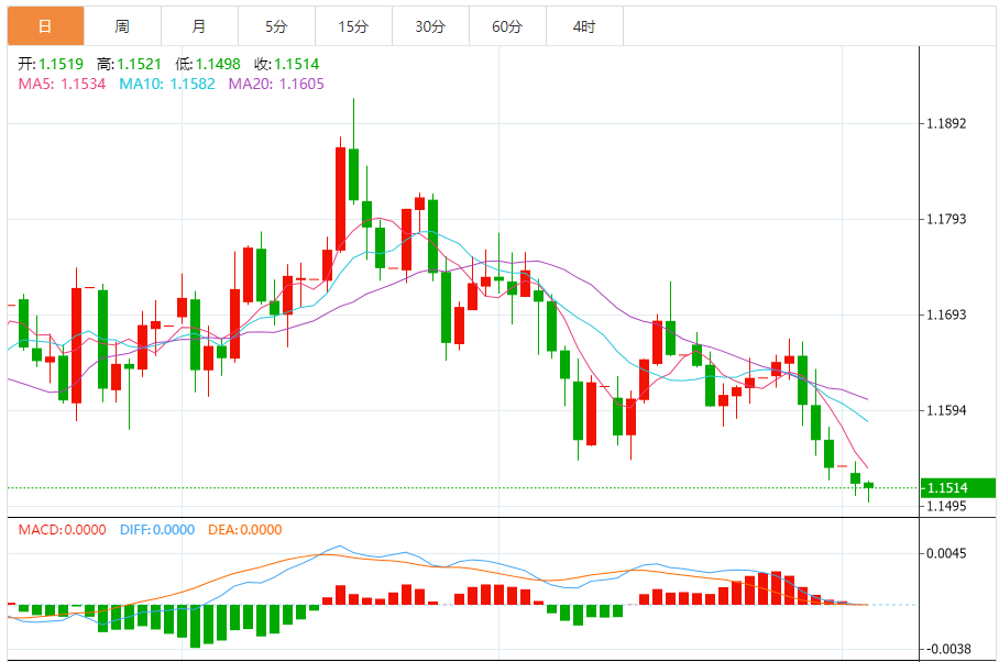 美元 美元指数周二连续第五个交易日走强,涨幅约0.15%,一度达到100.03的近三个月高点。从技术面看,美元指数短期支撑位在98.09的日内低点附近。美元指数当前已收复部分年内跌幅,年初至今跌幅收窄至7.9%,较9月时的11%显著改善。 欧元 欧元兑美元交投于1.1508附近,跌幅0.0868%。从日线级别来看,