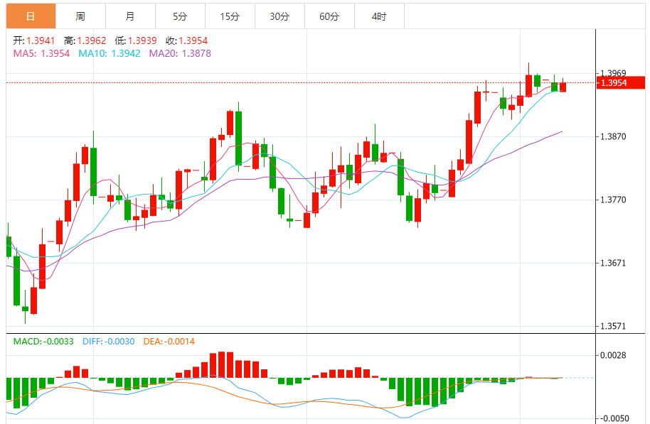今日周二,澳元兑美元报0.6594,跌幅0.38%;美元兑加元报1.3950,涨幅0.05%;美元兑瑞郎报0.7979,涨幅0.37%。 澳元兑美元汇率分析 技术点评:RI技术指标看跌,有进一步向下趋势。 阻力位:0.66300.66200.6610 支撑位:0.65800.65650.6550 美元兑加元汇率分析 技术点评:超短