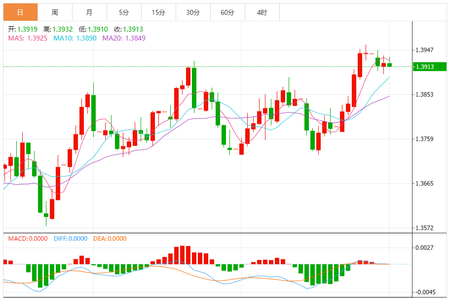 今日周二,澳元兑美元报0.6613,涨幅0.56%;美元兑加元报1.3919,涨幅0.03%;美元兑瑞郎报0.7974,跌幅0.04%。 澳元兑美元汇率分析 技术点评:RI技术指标被其上行趋势线支撑。 阻力位:0.66650.66500.6635 支撑位:0.65750.65550.6540 美元兑加元汇率分析 技术点评:超短线(