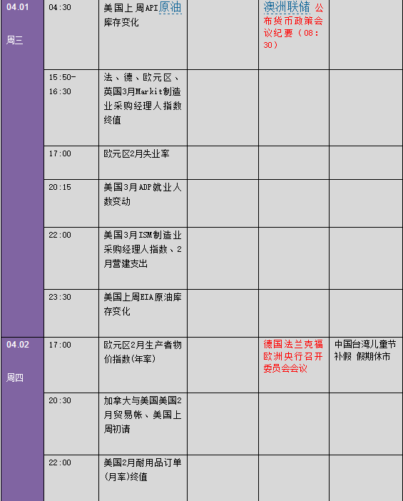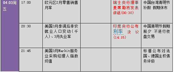 下周(03月30日至04月03日)事件中,重点关注美国3月ADP和非农数据。