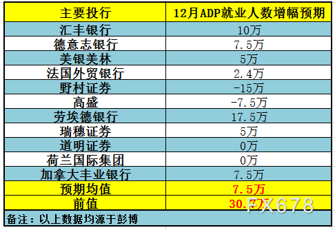 北京时间周三21:15将公布美国12月ADP就业人数,该数据素有“小非农”之称,包括德意志银行在内的11家大型投行发表了对12月ADP就业人数增幅的前瞻,具体如下: