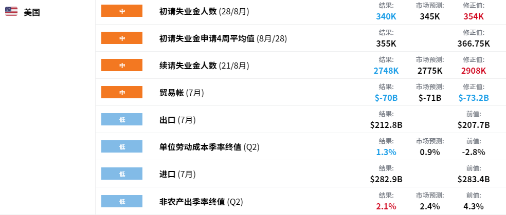 美国上周初请失业金人数增加34万,略低于市场此前预期的34.5万;续请失业金人数达到274.8万,也同样好于市场预期的277.5万。美国初请失业金人数已经连续数周不断下降,显示就业市场仍在逐步复苏。这对于周五即将公布的美国8月非农就业报告而言是一种好的预兆。